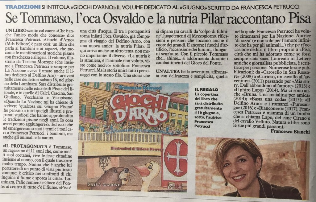 Questo libro racconta il “giugno pisano” con i suoi storici eventi – la Luminara, il Palio di San Ranieri e il Gioco del Ponte – attraverso gli occhi di personaggi speciali. Un bambino di undici anni e il suo nonno, Tommaso e Aldo, già protagonisti de Il delfino Arno a cui la storia si raccorda, e l’oca Osvaldo, anche lui ben noto ai lettori, ma che ha stavolta un nuovo interlocutore, la nutria Pilar.